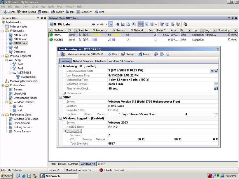 Upon start-up, NetCrunch presents a blank "atlas" of all known networks and nodes. We defined and ran a series of scans and probes to populate the atlas database and could see the resulting networks and nodes in dynamic "map" views set to our specifications.